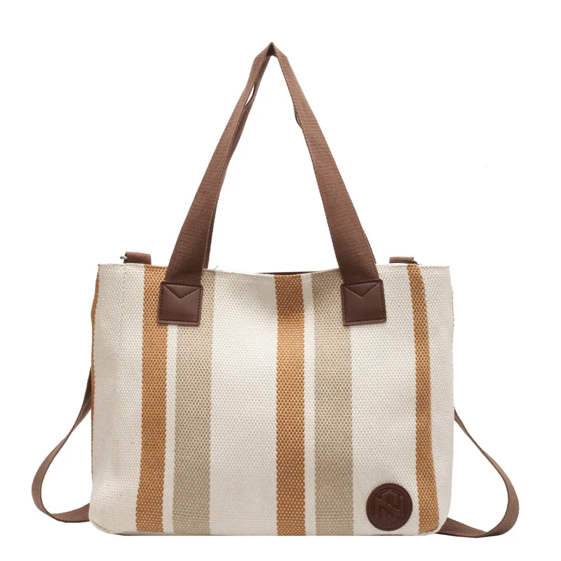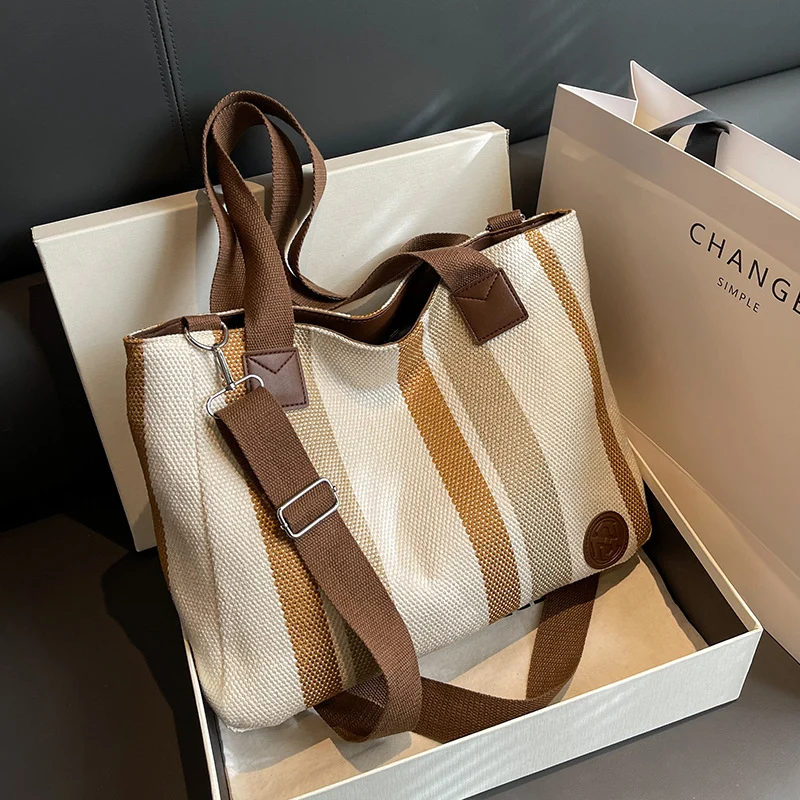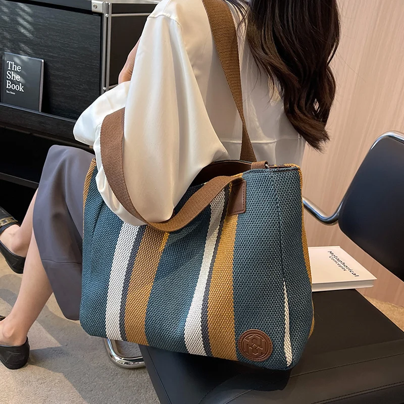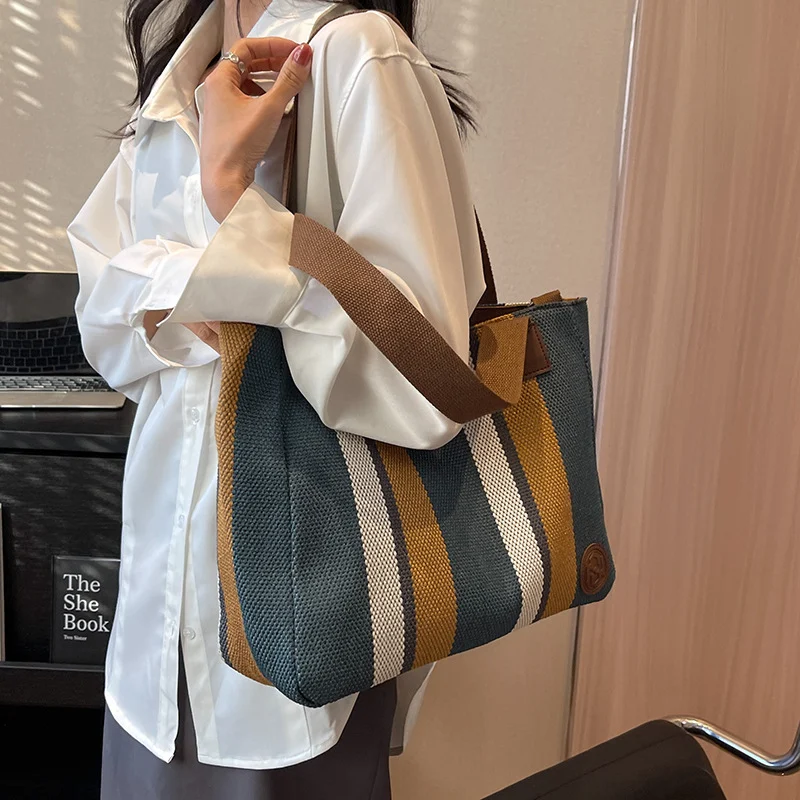 Korean-Style Large-Capacity Canvas Tote – Casual Fashion Shoulder Bag with Vertical Stripe Design